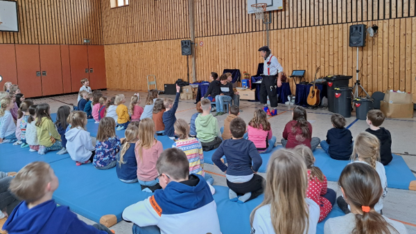 „Hey Baum - danke, dass du uns Sauerstoff machst!“ rufen die Roggenburger Grundschulkinder aus voller Kehle und Überzeugung. In nur wenigen Minuten hat der Clown und Entertainer Jo Brösele alle Zuschauer mit seiner Darbietung und seinen coolen Sprüchen in den Bann gezogen. Unterstützt von seiner Handpuppe „Jumping Jo“ reiste er am 22. April nach Roggenburg an und vermittelte den Kindern auf sehr kurzweilige, lustige und anschauliche Art Umweltbewusstsein: egal, ob Mülltrennung, Müllvermeidung oder Klimaschutz - durch Rätsel, anschaulichen Infos, einen Müll-Boogie-Woogie und so manch Zauberei waren alle Kinder voll bei der Sache. Nach knapp zwei Stunden war allen klar: Mehrweg vor Einweg, Müll auf den Boden werfen ist doof, und ein Kaugummi braucht sieben Jahre, um zu verrotten…